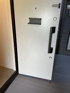 白い玄関ドアのちょうど中央付近にあり、かなり目立つ状態でした。