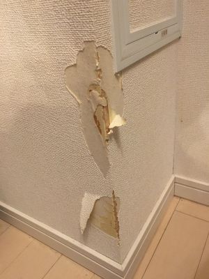 HOME > 施工ブログ:ペット:壁紙クロス爪による引掻き破れ > ペットひっかき傷壁紙クロス破れ補修-大阪市此花区